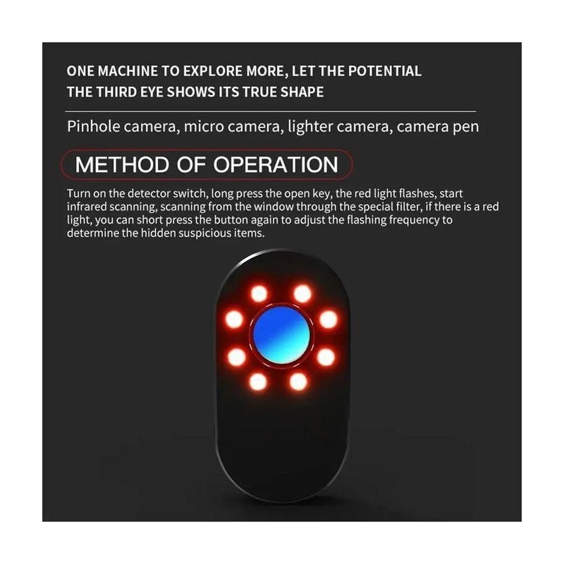 • Détecteur infrarouge multifonctionnel :Ce détecteur infrarouge portable est un outil essentiel pour les voyages, offrant une protection contre les caméras cachées. Il est compact et facile à transporter.• Origine : Chine continentale• Marque non spécifiée :Malgré le fait que la marque ne soit pas spécifiée, ce produit est un choix judicieux pour ceux qui cherchent à protéger leur privacy.• Catégorie : Imagerie thermique infrarouge• Fonctionnalité anti-espionnage :Avec sa fonctionnalité anti-espionnage, ce produit vous permet de savoir quand vous êtes surveillés, offrant ainsi une tranquillité d'esprit lors de vos déplacements.• Idéal pour les outils :Cet appareil est un outil idéal pour ceux qui ont besoin de savoir s'ils sont surveillés. Que vous soyez un journaliste ou un entrepreneur, ce produit est un ajout utile à votre trousse d'outils.Spécifications:Protégez la vie privée et refusez de prendre des photos sincèresQue la vie privée de chacun soit protégée. Méthode d'utilisation: ① Allumez l'interrupteur d'alimentation latéral② Appuyez longuement sur la touche de marche pour entrer en mode de balayage infrarouge et dans la fenêtre de détection du cache-œil③ Appuyez brièvement sur la touche de fonction pour régler la fréquence clignotante de la lumière rouge ou l'éteindre④ Scan l'environnement, observer le point d'éclair rouge anormal à travers la fenêtre et trouver l'objet suspectRemarque: Les caméras cachées peuvent être trouvées plus rapidement dans les environnements sombres. La distance de détection optimale du détecteur est de: 1,5 M à 5M. Si l'angle entre le détecteur et l'appareil photo est plus vertical, les points lumineux seront plus évidents.