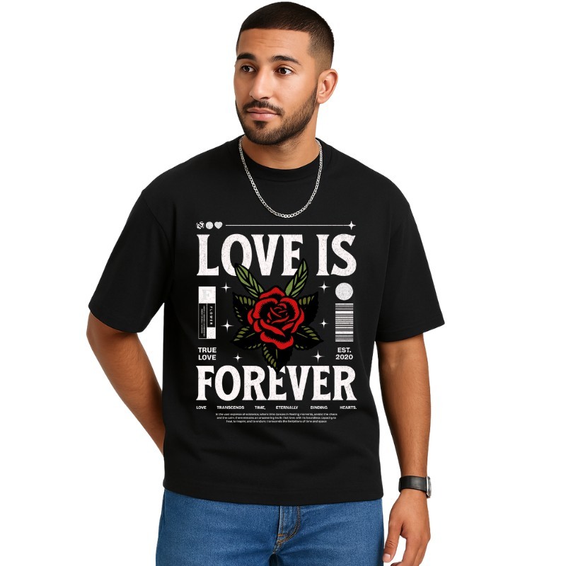 Exprimez votre amour intemporel avec ce t-shirt graphique 'L'amour est éternel', mettant en avant un design de rose saisissant. Parfait pour des sorties décontractées et des looks élégants sans effort.